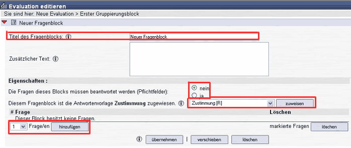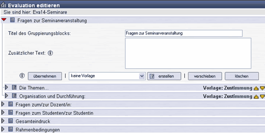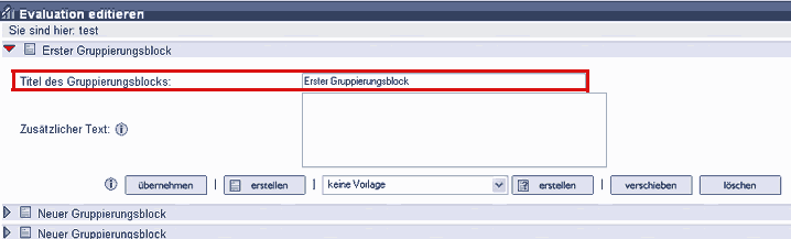 You are now on the second level — the level of the grouping blocks. The grouping blocks themselves do not contain any questions, but instead are a type of container which contains question blocks. Grouping blocks thus prestructure the evaluation. Grouping blocks can contain either question blocks or subgrouping blocks - never both! Question blocks are thus always the last levels or the “leaves of a tree”.