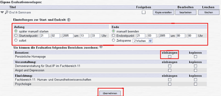 In Area 2 you can search for existing templates in Stud.IP. Templates which have been found are displayed in this area. You can then modify them and subsequently publish them. Thus, you do not have to prepare the templates yourself. This is normally the most efficient way to perform evaluations.