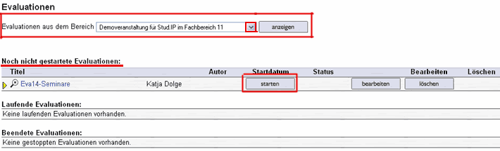 In Area 4 you see an overview of all your evaluations: those which have not yet run; those that are currently running; and those that are no longer running. If you have not yet published any evaluations, this area is empty — as in the example above.