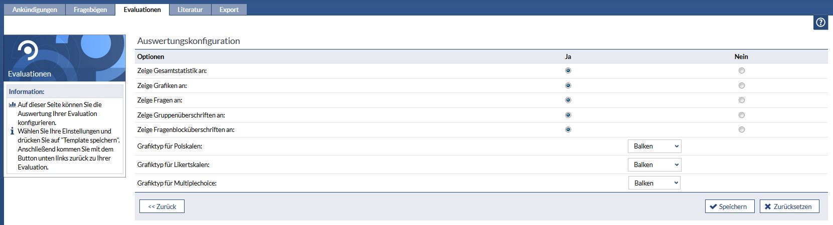 - When you change the standard konfiguration and you want to keep the settings for further evaluations you need to save your modifications. If you want to reset your changes you need to press the button "Reverse" and all changes will turn back to the standard konfoguration.