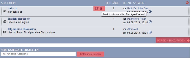 Choose a name for your categorie and click „Kategorie erstellen” to create your categorie. The default categories neither be edited nor be deleted. Default categories are displayed with a red “i” symbol ( Attach:info-circle.png Δ ). Other categories on the other hand can be edited and deleted entirely. To do so just click “Name der Kategorie ändern” or “Kategorie entfernen” on the top right corner of the categorie.