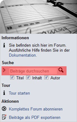 To the right you can browse the forum by title, content or author. Dependent on what you are looking for you can mark a special point and enter some keywords. Click on the magnifying-glass after you entered the text to search the forum.