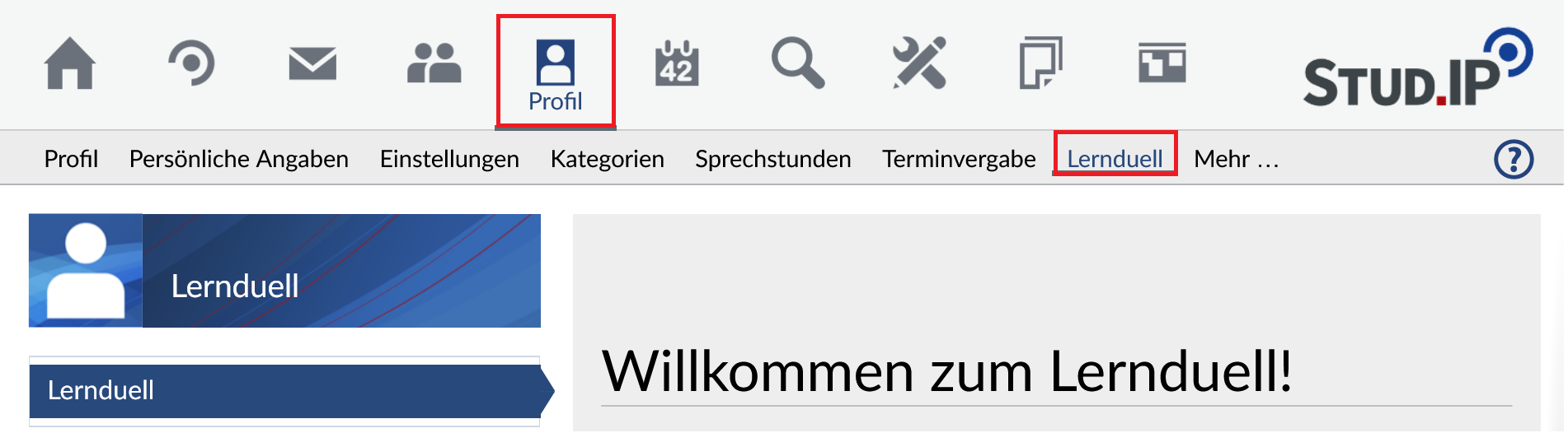 The plugin is located within the own profile in Stud.IP. Navigate to your profile and go to the tab "Lernduell" (learning duel).