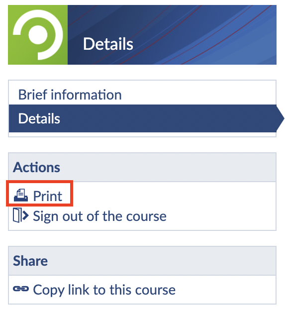 Sometimes it might be helpful to be able to print out information about a course. Therefor we have integrated a Print view feature. To access it, activate the Overview tab and choose the subitem Print view.