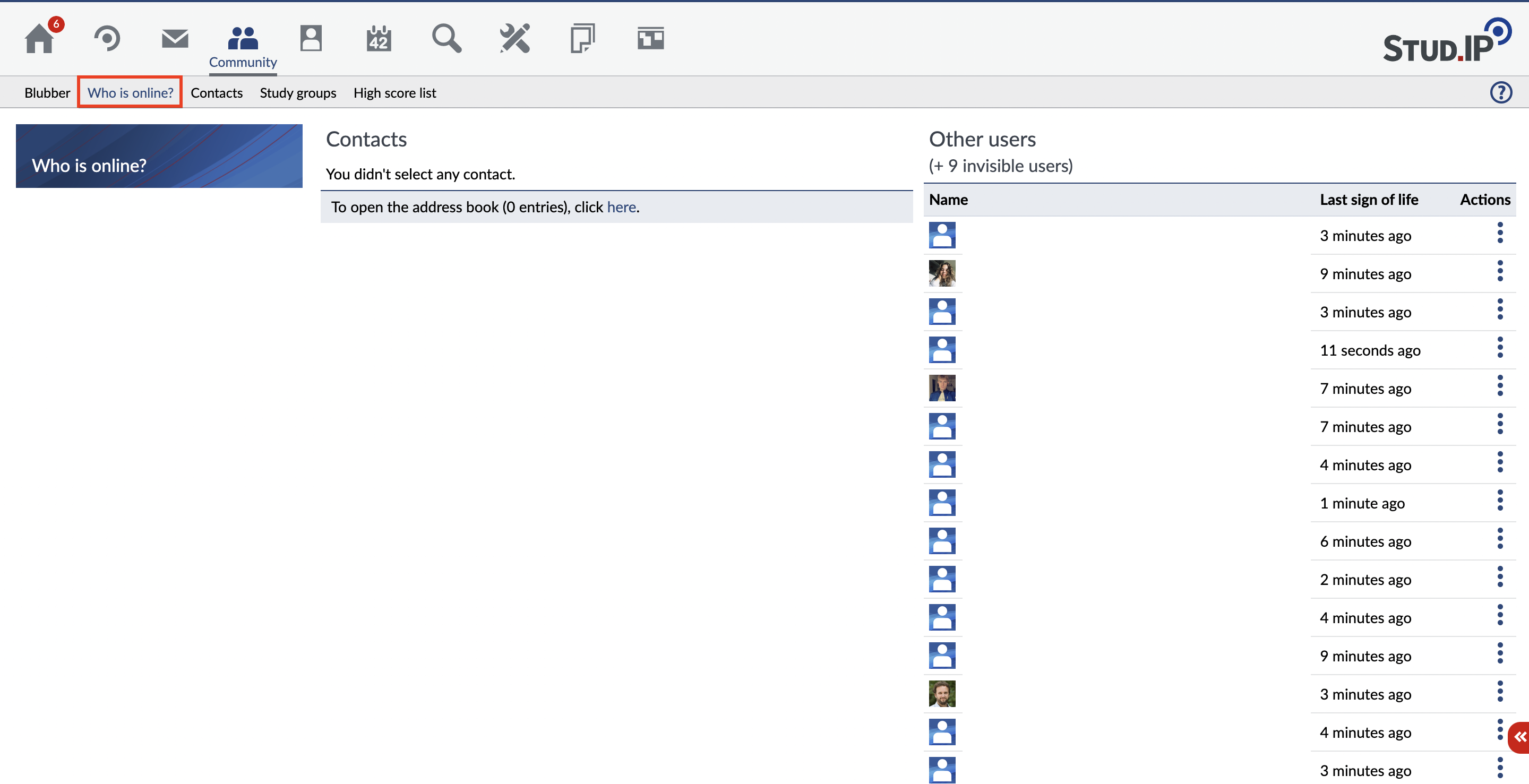 If a given person is inactive for a certain period of time, he or she is removed from the list. Similarly, the person is removed when he or she properly logs out of the system via the logout link on the header bar. It can be aggravating if you leave Stud.IP without having properly logged out — after all the other users still see you in the “Who is online” list for at least 5 minutes and perhaps attempt to contact you. It is therefore correct "netiquette" to properly log out of Stud.IP by clicking on the logout link.< Interaction with others | Overview | Messages >