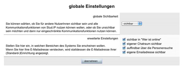 Here you can set how you wish to be globally locatable in the system. The “Globally visible“ item specifies whether you can always be located. If you select “Hidden“ here, the result is that you cannot be found in Stud.IP, neither via the Search for people nor via the list of those users who are currently logged in; nor is your profile visible to other users.