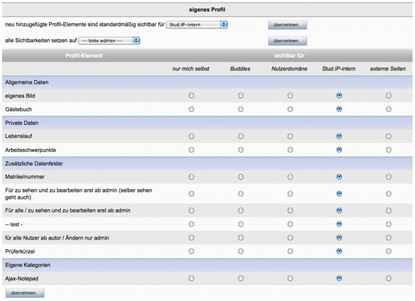 If you enter additional data at a later date (e.g. your Curriculum Vitae), but have not yet made any visibility settings, you can stipulate what kind of visibility such new fields should have by default. This is realized via the corresponding selection menu.