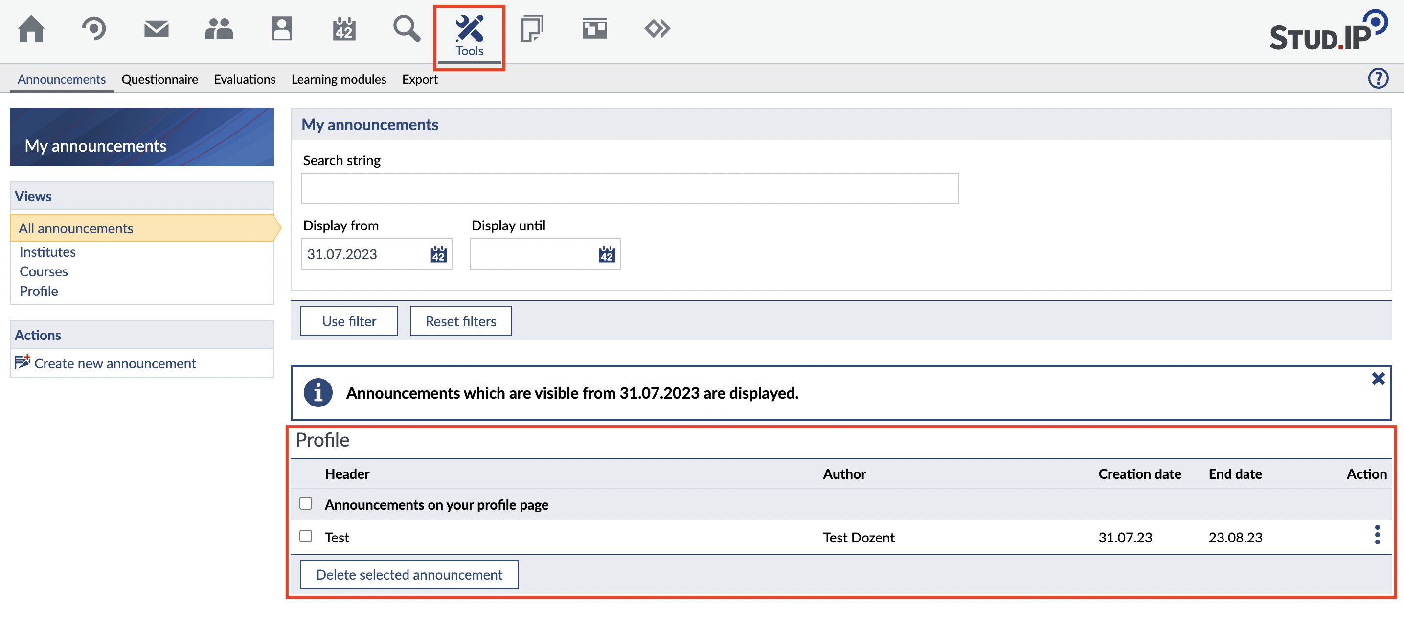 Alternatively, you can also select the Announcements tab in the Tools area and create a new announcement using the Create Announcement button in the sidebar on the left: