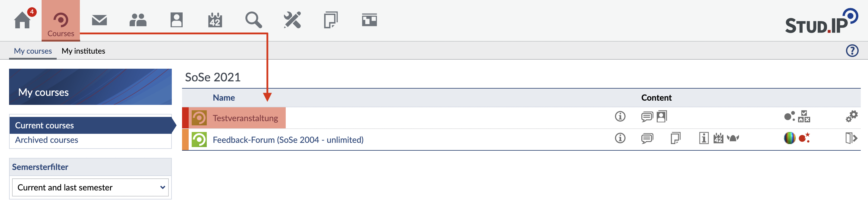 First you need to activate the function by choosing the event you want to book the resource for. Therefore, please login to Stud.IP and go to the course overview page. Next, navigate into the wanted course.