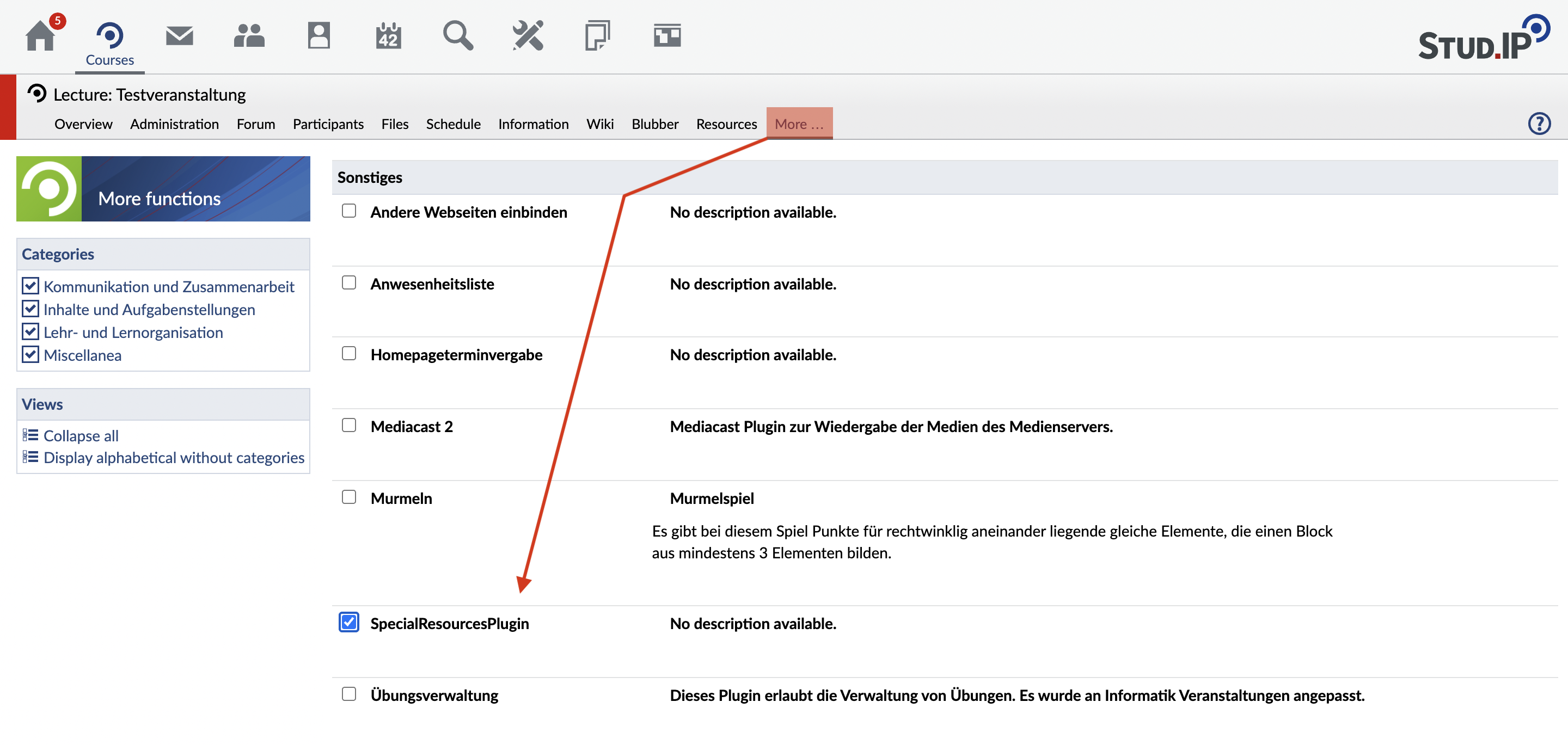 In order to insert the tab Resources in the overview bar of your event, you have click on the tab More... and put a check at the field SpecialRessourcesPlugin. Now you will find the Resources tab in your event bar and can use it to manage resources.