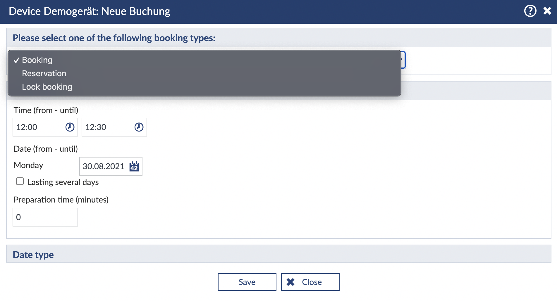 If you have clicked on a box in the table as described above, a window will appear in which you can edit your booking. First, you have to select the type of booking. You can choose between booking, reservation and lock booking. You can also adjust the time and date of your booking.