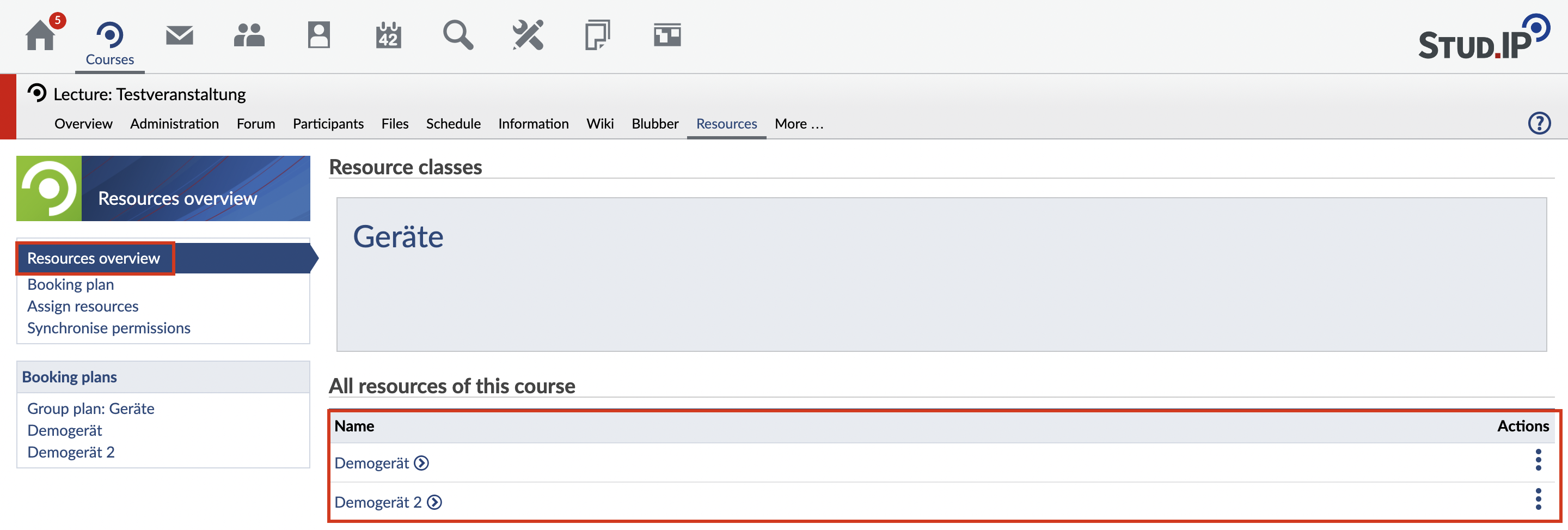 To get an overview of the resources you have selected, you have to click on the item Resource overview. All assigned resources will be displayed there. You can also use the resource allocation plan to see who booked the resource and make changes if necessary.