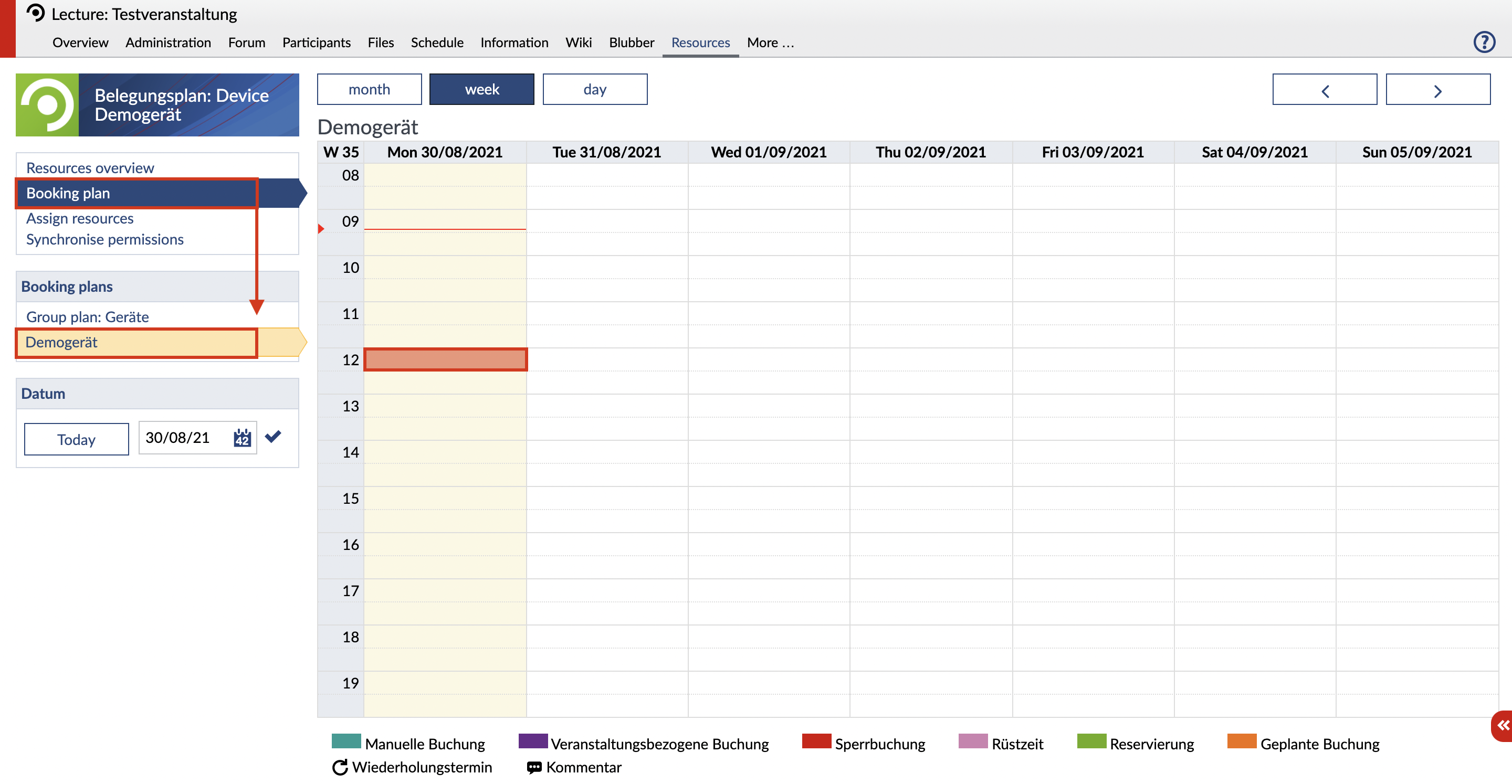 For booking the assigned resource, you now go to the booking plan and choose the resource you want to book. In our case this is the already assigned "Demogerät". Next, press in a box in the displayed table. You can switch between a month, week and day view.
