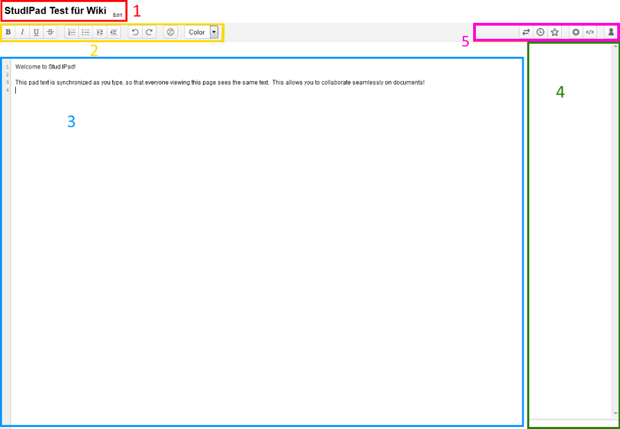 The StudIPad works in real time. That means that changes immidiately reach all the participants who ativated the corresponding StudIPad. To keep an overview who changed the text and what got changed every author has its own colored text. You can find the corresponding corlor ledgend by clicking on the