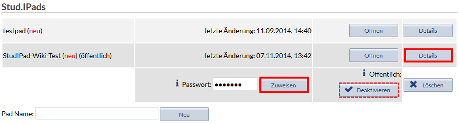 After the creation the newly set StudIPad now occurs in the overview. You can now ad a password that everyone needs to use who wants to join the StudIPad. Therefor you need to click on "Details" and type in the password.