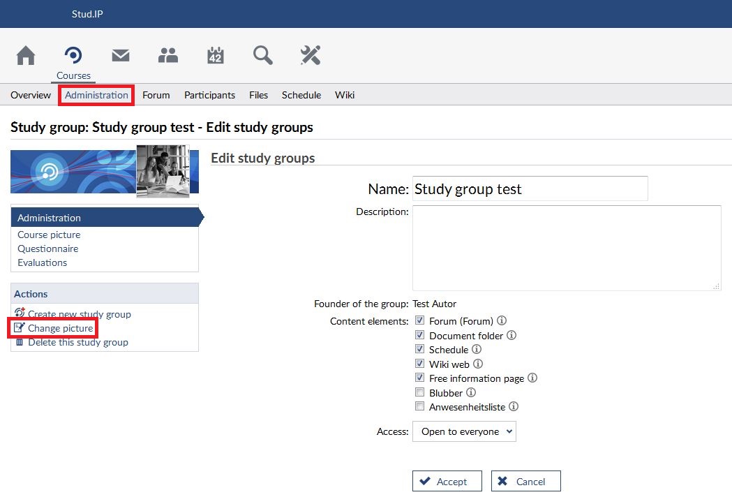 In addition, you have the option of defining a picture for the study group. In the navigation of the administration page is the function "Change picture".