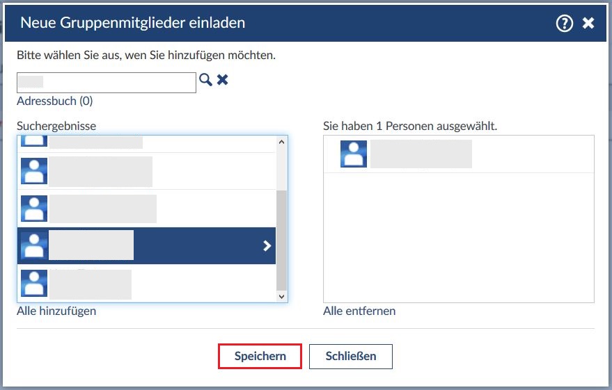 You can type in to the searching field either the user name, the forename or the lastname of the person you want to invite. Start the searching with the loupe. You receive a hit list from witch you choose the desired person. You choose the person with one click on it. To set the search results back and invite a new person you need to click on the x symbol. Now you can start a new research. Confirm the seach with the button "save" to invite the person/s to the study group.