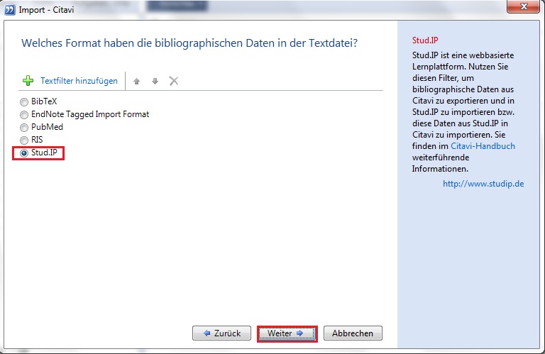3. Choose "Stud.IP as importfilter". Click on "next".