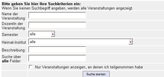 There you can, for example, enter a Title key word or a Lecturer’s name to locate a specific course. However, you can also select a specific semester in order to view all the courses in this semester. Or only all the courses in which you participated at that time. You can also leave everything as it is and view the complete contents of the Archive by clicking on Start search (Attention: modem users! This can take a while!).