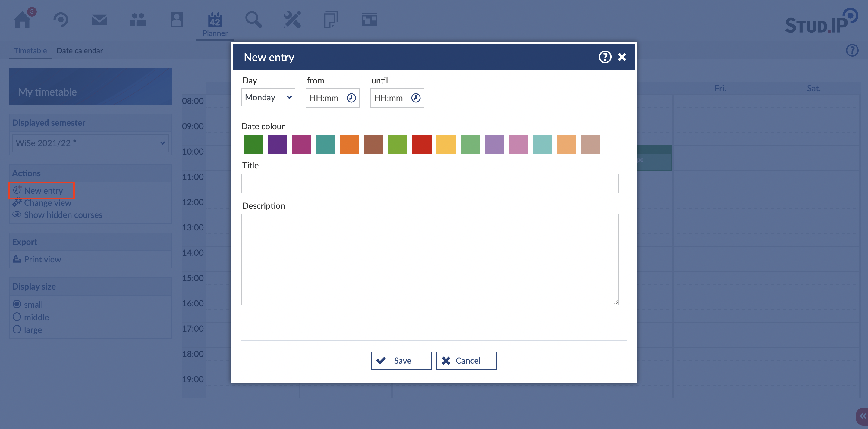 The Appointment calendar in Stud.IP functions like a time planner made of paper, but it has decisive advantages. It is more flexible and easier to adapt than its counterparts in the real world. And it is more secure than all other appointment calendars which you have perhaps previously encountered in the computer field. Your appointments are securely safeguarded against prying eyes on the Stud.IP server. Thus, you not only have access to your appointments from every Internet-capable computer in the world, but you can also be certain that even in the event of a sudden system crash or virus infestation of your computer your time planning data will not be lost.
