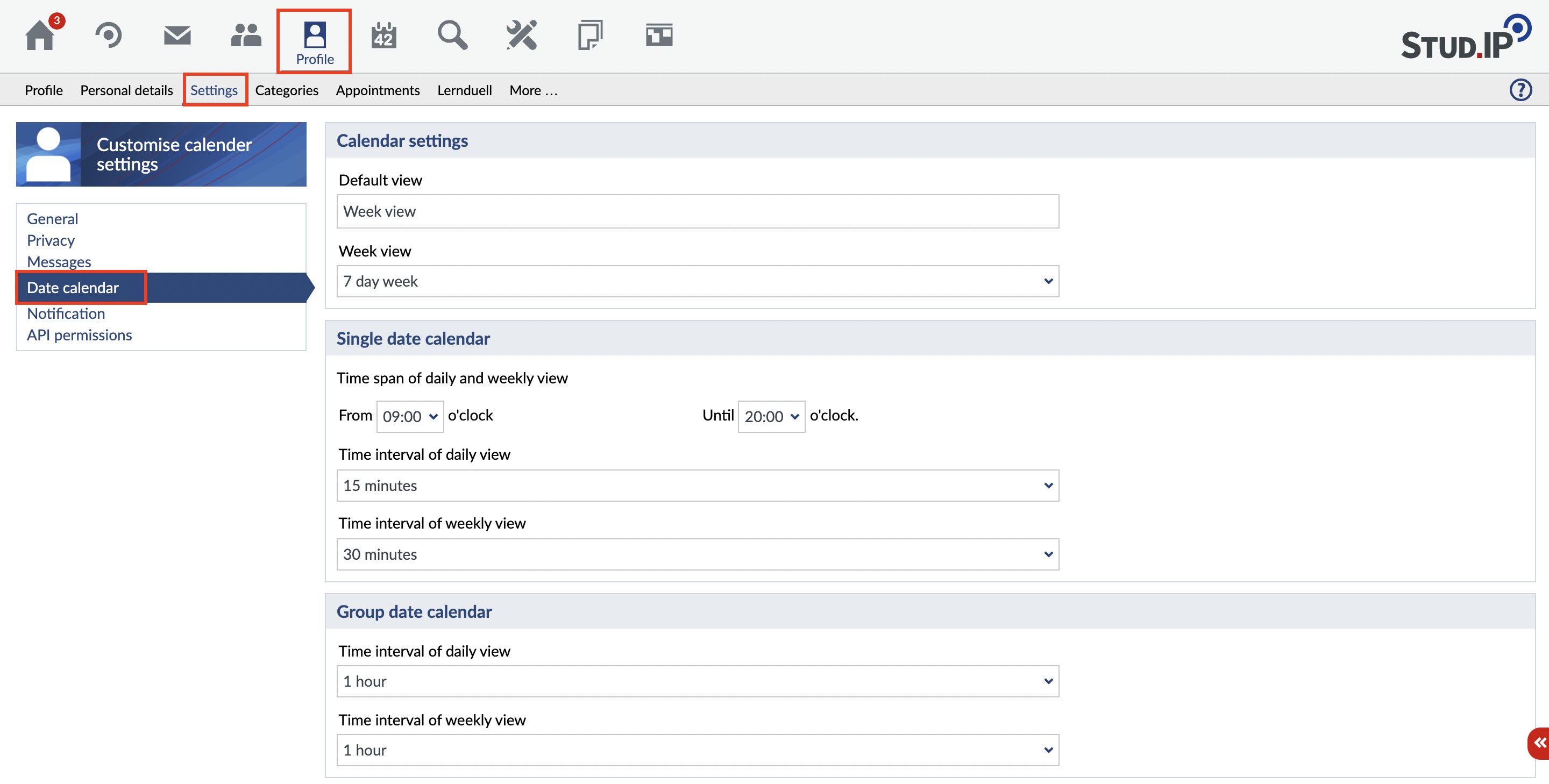 To change the appearance of your calendar click on "Profile", "Settings" and then select the tab "Date calendar".