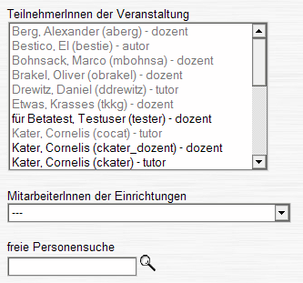 The Person area is used to find the users before one assigns them to the groups. The following can be selected: all participants of the course, all members of the participating organizations, as well as an unrestricted search across all users of the system. Mark the users whom you desire to assign to a group with the mouse. If a user has already been assigned to a group, he or she appears grey. This facilitates the complete assignment of all the people to at least one group. However you can also assign the person to other groups (example: student assistant AND women's representative).