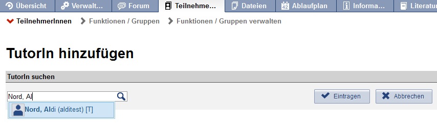 A new page with a search field will open. In the field you can enter the first- and last name or the Stud.IP user name and by clicking on the enroll button Attach:enrolbutton.jpg Δ the user will be added as a lecturer/tutor/author to the course.