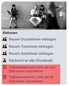 Attach:Warteliste1.jpg Δ On the registration and waiting list – as well as on the normal participant list – you can see the course of study of the user. This is important if you would like to see during the first session of the course if all the attending students did get into the course and what course of study they belong to. Simply print out the participant list via the print function of your browser.