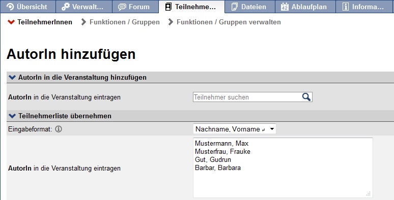 Always enter just one „Lastname, firstname“ or „username“ per line. By clicking on the enrol-button Attach:enrolbutton.jpg Δ participants are added to the course.