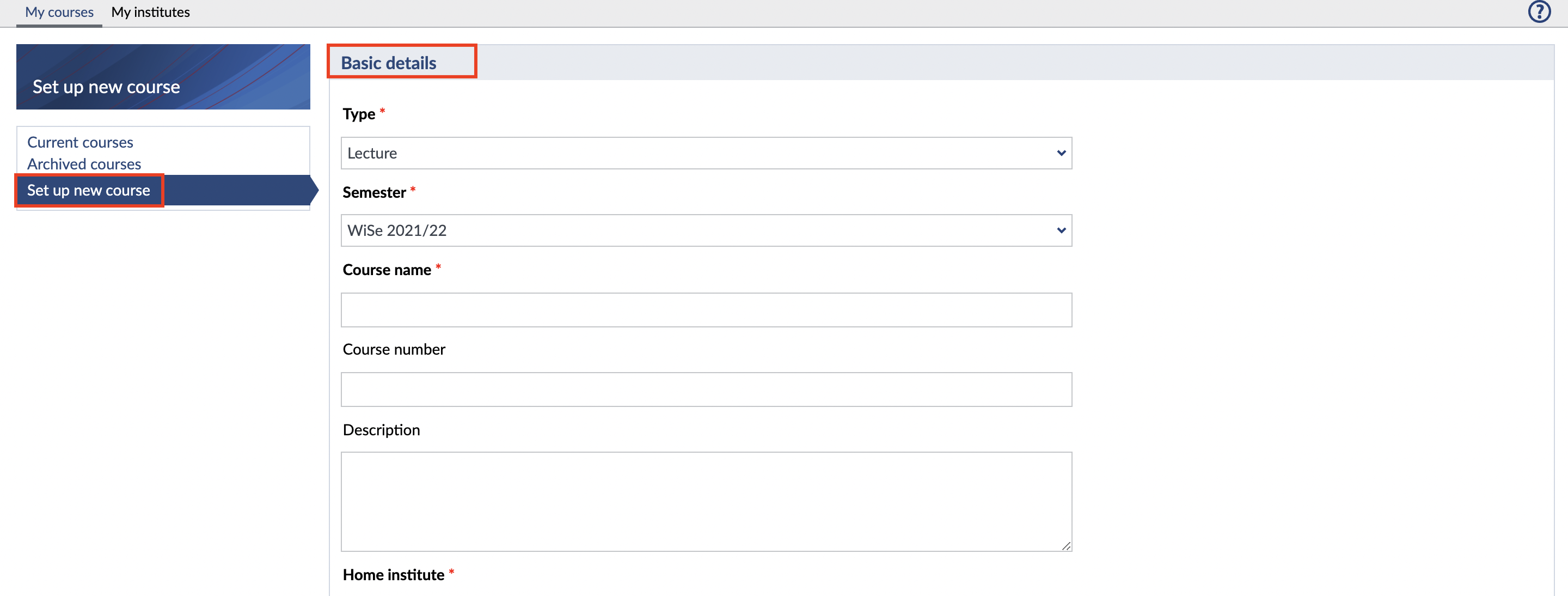 Then select your home institution from the list. The list opens when you press the small "down arrow". If you only lecture at one institute, you can only select this one.