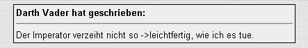 In Forums or in the Guest book you have the option of quoting someone or a special source, so that the context on which you are now expounding is clear. The syntax for this is more simply shown than explained: