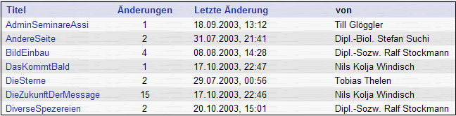 You will find a list of changes made since your last Login under the adjacent menu item "New pages"'. There you are shown a list of changed pages and can either view the current version of the respective page or move directly to the Change view (see below). The “Changes” column states how often a page has been changed; additionally the date and author of the last change is displayed.