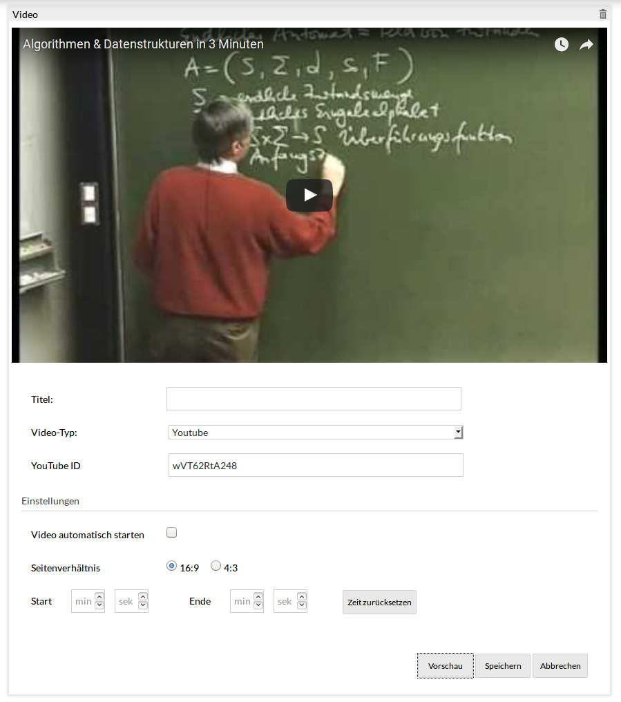 - eingebettetes Video (iFrame) ermöglicht das einbetten mittels <iframe>-Tag. Dies ist notwendig wenn ein spezieller Player bereitgestellt wird.